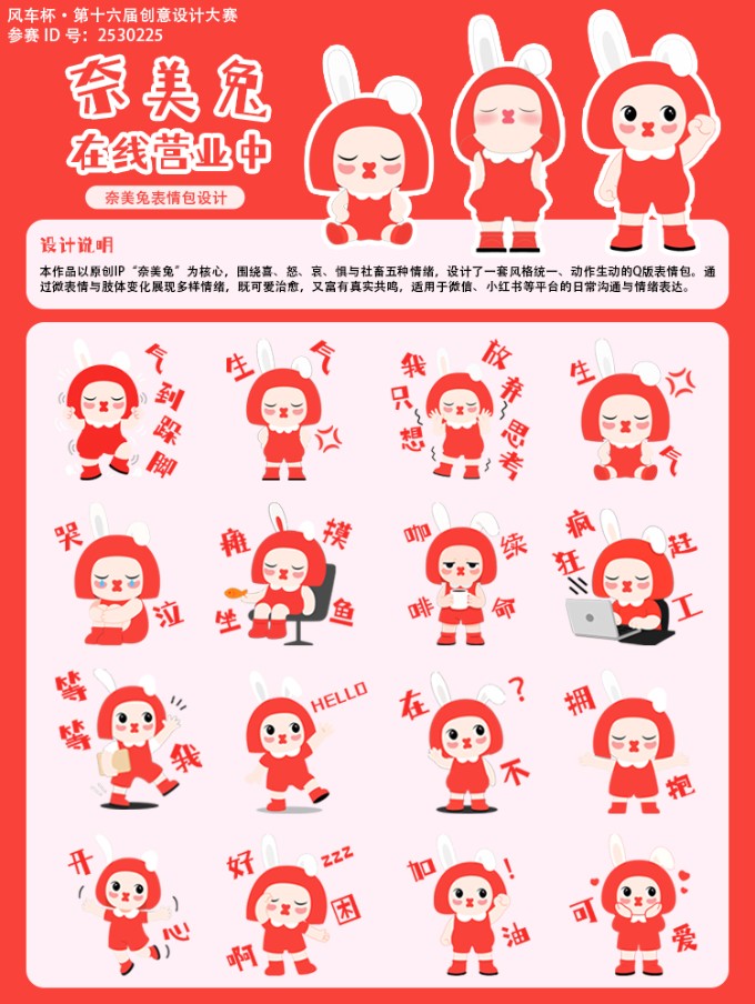本作品以原创IP“奈美兔”为主角,通过一组情绪表情包,描绘当代年轻人日常生活中的微妙心绪与真实状态。她是一只永远嘟着桃心嘴的小兔子,外表可爱,内心却藏着千层波澜。作品通过“极简”的视觉语言,融入轻微夸张的肢体动作与典型场景,捕捉当代年轻人每日情绪波动的真实状态。同时也保留了童趣与幽默感,使表情包具备亲和力与代入感。