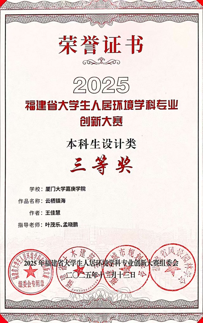 近日,2025年福建省大学生人居环境学科专业创新大赛圆满落幕。我院环境设计专业学子在本届大赛中表现优异,共斩获奖项13项,其中二等奖1项、三等奖2项、优秀奖10项,充分展现了专业教学成果与学子的创新实践能力。